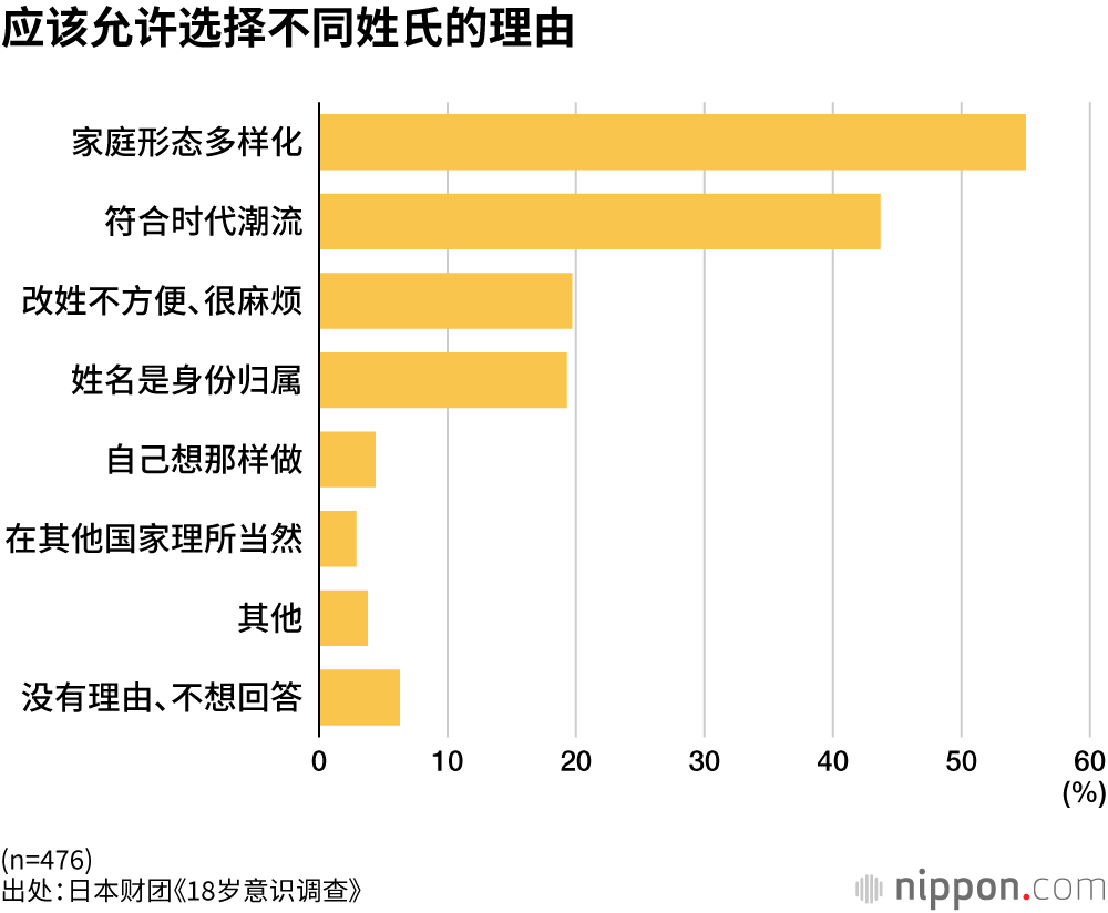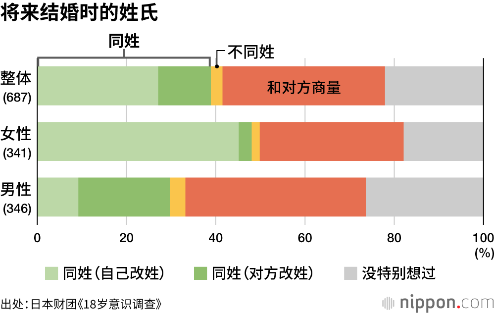 整体上只有20.5%的受访者认为“应该维持”这种夫妇同姓的制度,尤其是女性受访者中,仅有12.9%支持。无论男女,都以希望创建“可以选择不同姓氏”制度的受访者为最多,在女性中的支持率达到53.0%,超过了半数。