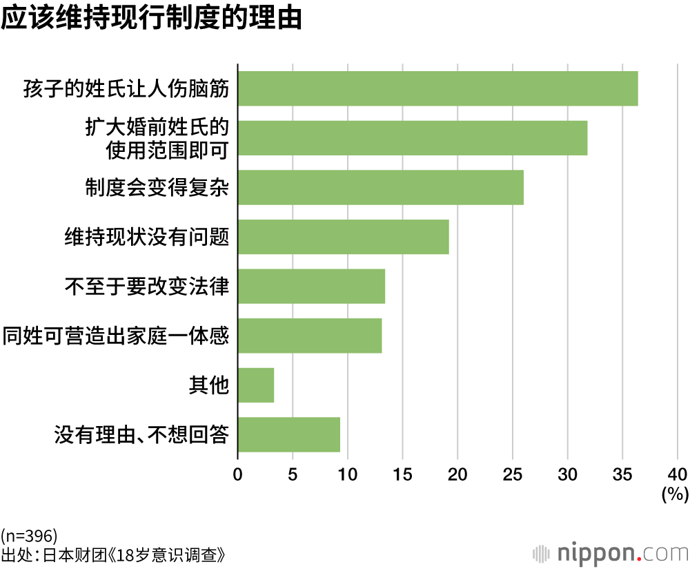另一方面,认为应该维持现行夫妇同姓制度的受访者中,列举“会为孩子的姓氏伤脑筋”的受访者最多,占比为36.4%。整体上31.8%的受访者认为“即便婚后改姓,但只要扩大婚前姓氏的使用范围就足以解决问题”,女性受访者的该比例为47.7%,男性为19.1%,性别差距明显。只有13.1%的受访者认为“同姓对于营造家庭一体感是必要的”。