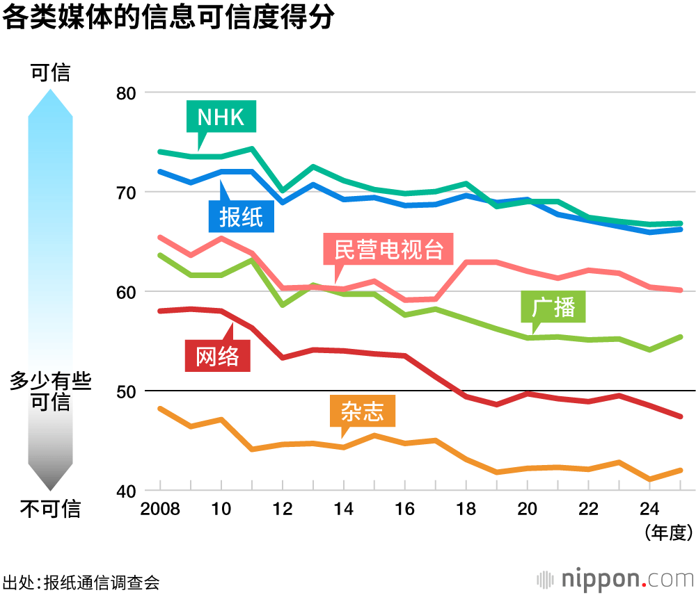 关于每天的新闻接触率,选择“网络”的受访者占比为46.5%,然后依次是“民营电视台”(46.1%)、“NHK”(35.8%)、“报纸”(33.4%)、“广播”(9.2%);在信息可信度(满分100分)方面,“NHK”以66.8分位居第一,“报纸”(66.2分)以微小差距排在第二;每天接触最多的“网络”的可信度长期呈下降趋势,同比降低1.1分至47.4分。