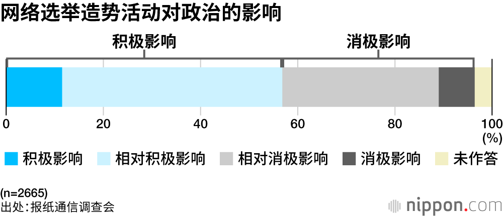 关于在选举期间使用互联网和社交媒体开展造势活动,56.8%的受访者认为对日本的政治会产生“积极影响或相对积极的影响”,大幅高于认为会产生“消极影响或相对消极的影响”的受访者比例(39.6%)。