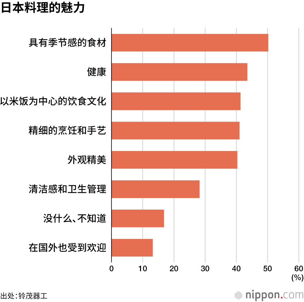 关于日料的魅力,选择“使用具有季节感的食材”的受访者最多,占比为50.2%,选择“手艺”“外观”等选项的受访者比例也达到了40%。不单单是美味,审美意识和文化内涵也成为了支撑日料魅力的要素。