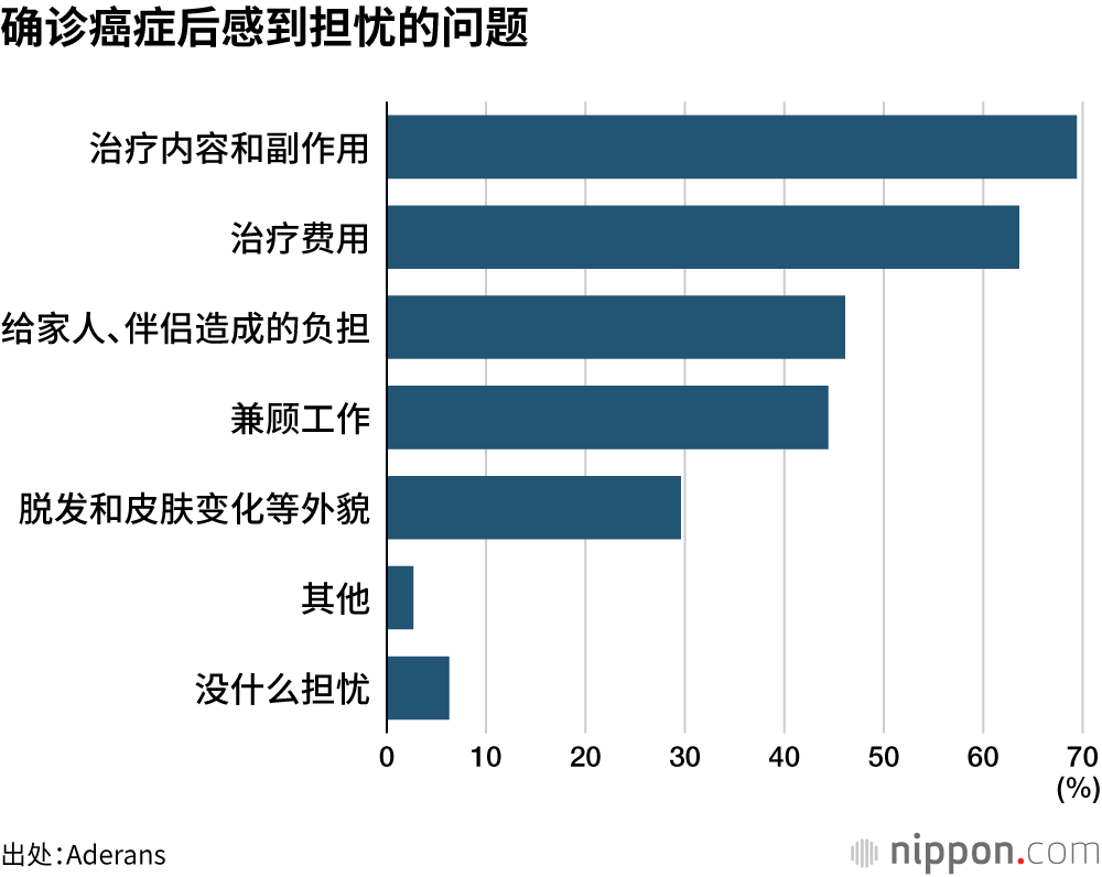 关于“确诊癌症后感到担忧的问题”,“治疗内容和副作用”毫无悬念地排在首位,列举该项的受访者比例达到69.4%,但也可以看出受访者对金钱、给家人造成的负担、工作等生活方方面面都会产生各种担忧。列举“脱发和皮肤变化等外貌”的受访者也达到了近三成。