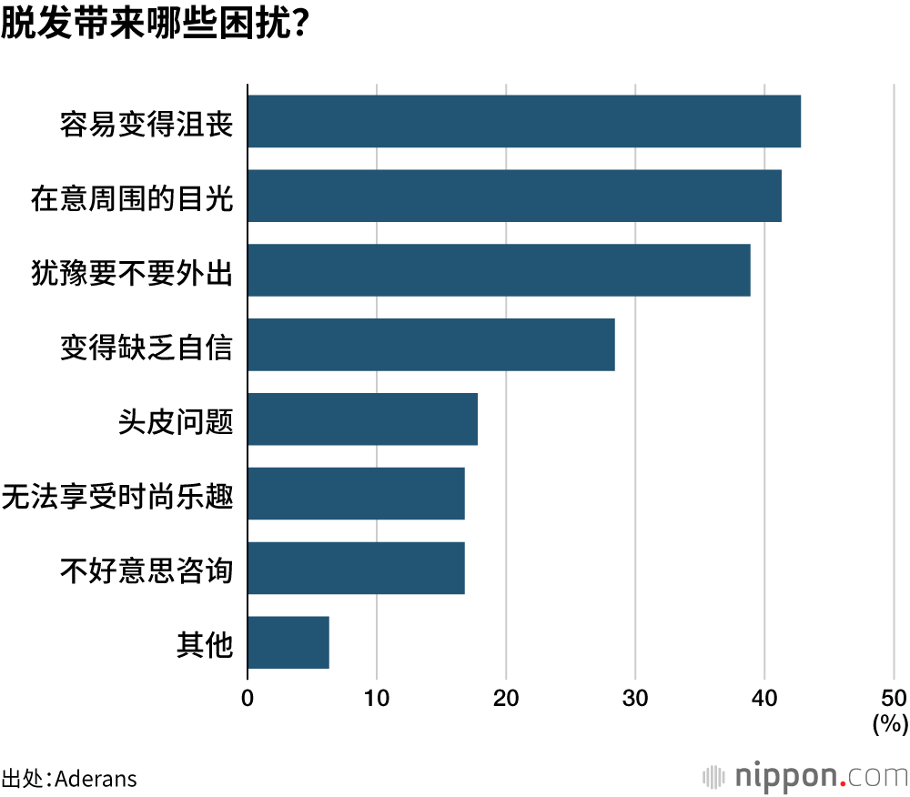 关于脱发方面的困扰,列举“容易变得沮丧”“在意周围的目光”“犹豫要不要外出”的受访者比例达到40%左右。可以看出,脱发并不只是外貌的问题,还会对社会活动造成限制,对患者的心理和行为两方面产生了巨大影响。