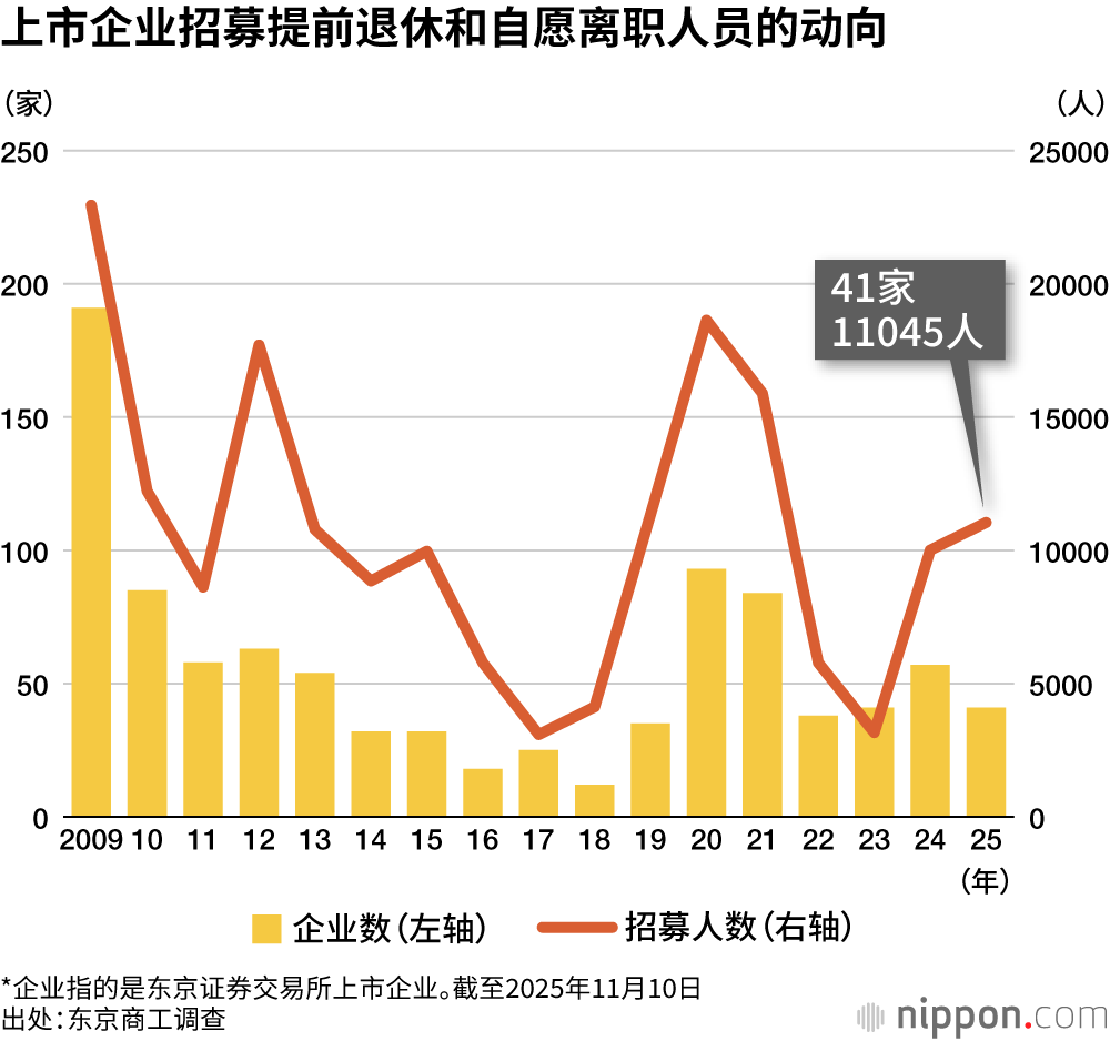 东京商工调查公司的统计显示,截至11月10日,东京证券交易所上市企业2025年招募的提前退休和自愿离职人数为11045人,比2024年全年的10009人多出1000人以上。招募企业数量为41家,同比有所减少,但由于大型企业开展大规模招募,导致总人数增多。