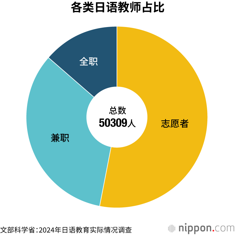 日语教师人数为50309人,同比增加约4000人,首次超过5万人。但全职教师仅为6847人(13.6%),半数以上(26721人,53.1%)以志愿者身份教授日语。