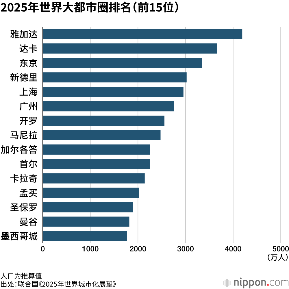联合国近日发布的《2025年世界城市化展望》报告显示,东京的总人口即首都圈地区人口为3341万人,位居全球第三。大阪排在第25位(1296万人),名古屋排在第49位(714万人)。