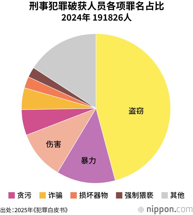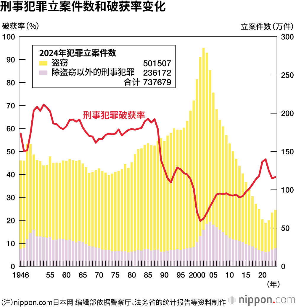 法务省发布的2025年版《犯罪白皮书》显示,2024年全年刑事犯罪立案件数为737679起,同比增加了3万起以上,已连续三年增加。其中,盗窃案501507起,占到案件总数的近七成。