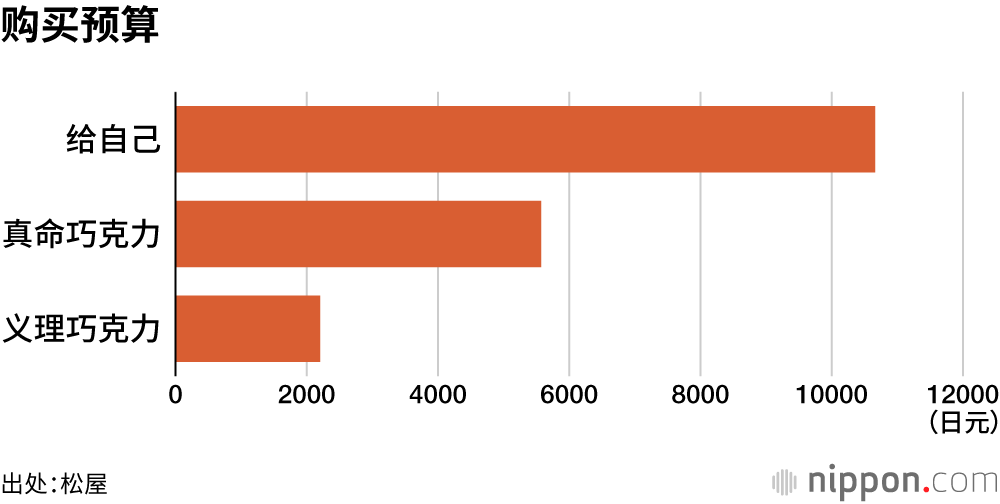 人们购买巧克力的预算变化,也印证了上述趋势。给自己的巧克力预算平均为10662日元,这是自该问卷调查实施以来首次突破1万日元;送给真命之人的巧克力预算平均为5573日,约是“给自己”的一半;而用于“义理巧克力(一份)”的预算更少,仅为2205日元,还不到“真命巧克力”的一半。