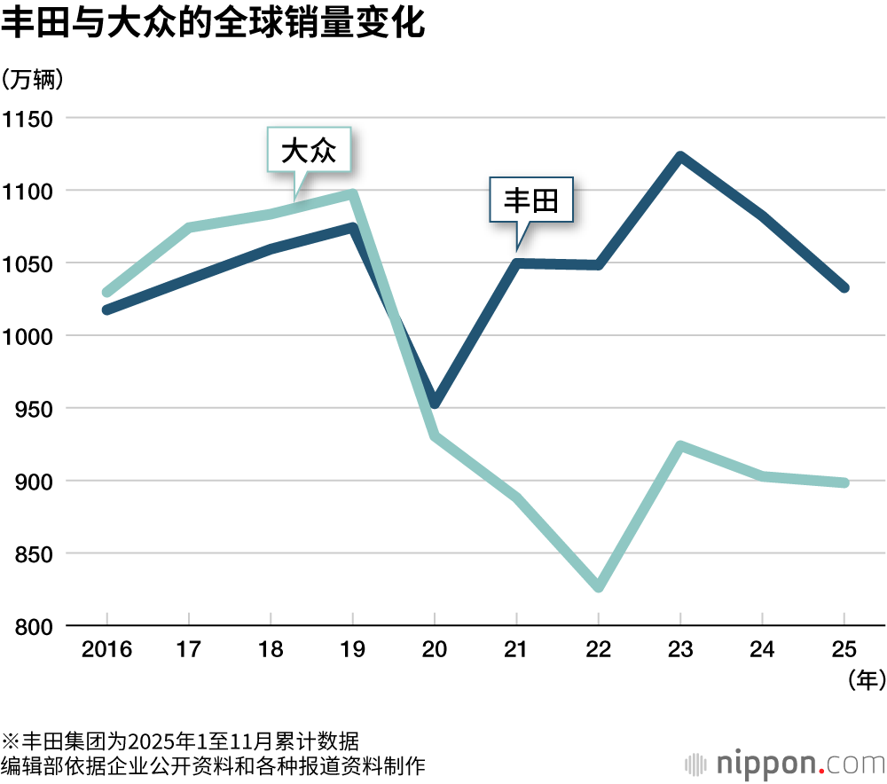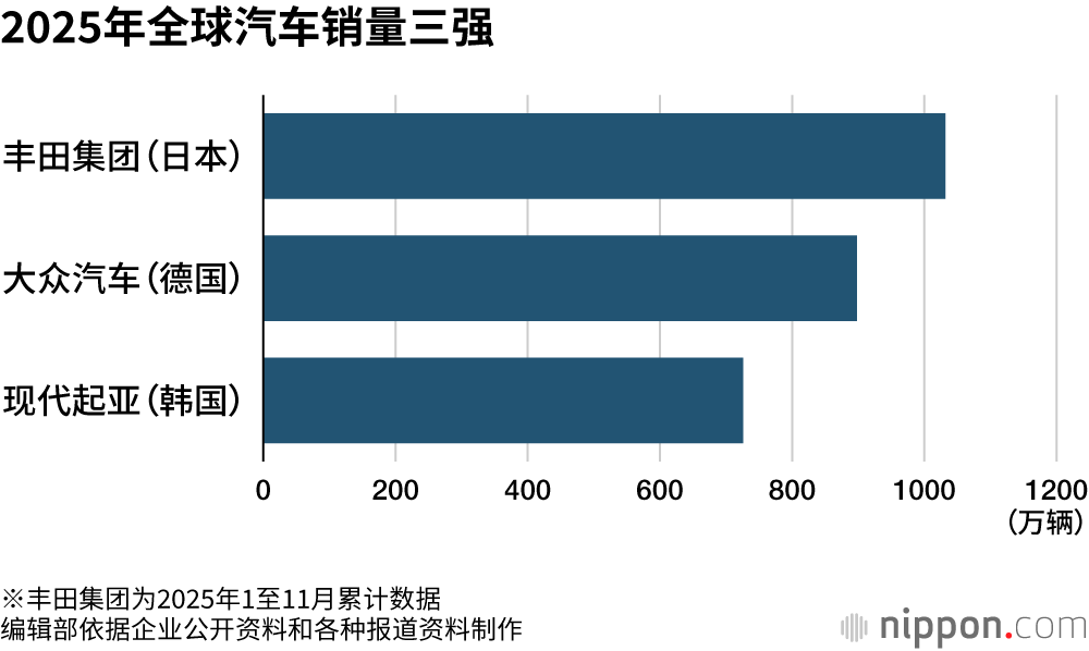 丰田汽车集团(含大发、日野汽车)2025年1至11月全球销量累计达到10327976辆,同比增加4.8%。而作为竞争对手的德国大众汽车(VW)1至12月全年销量同比减少0.5%至8983900辆,丰田已提前锁定全球销冠。