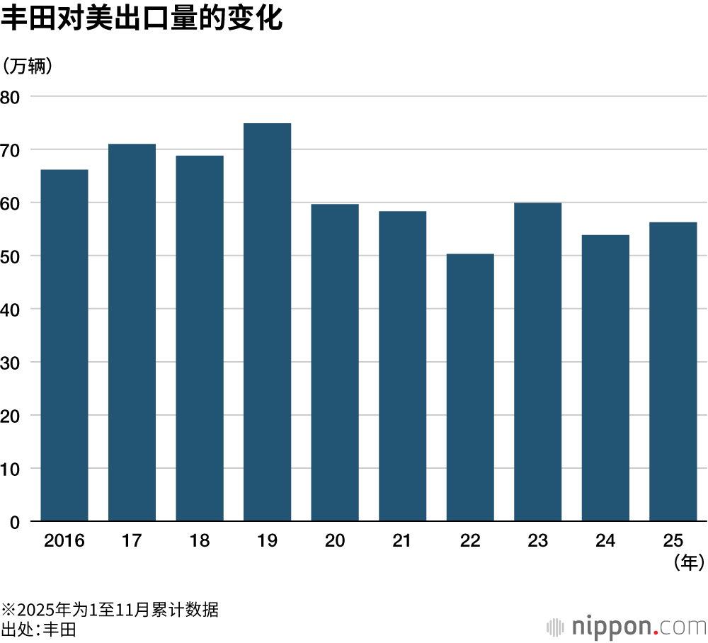 2025年特朗普关税横行肆虐。日本的汽车关税最终从原来的2.5%被上调至15%,但按地区计算占到丰田出口总量三成的对美出口量(1至11月)依然达到56万辆,已经超过了上一年全年的53万辆。
