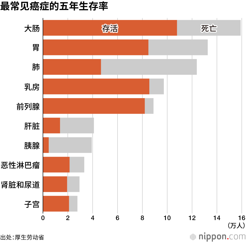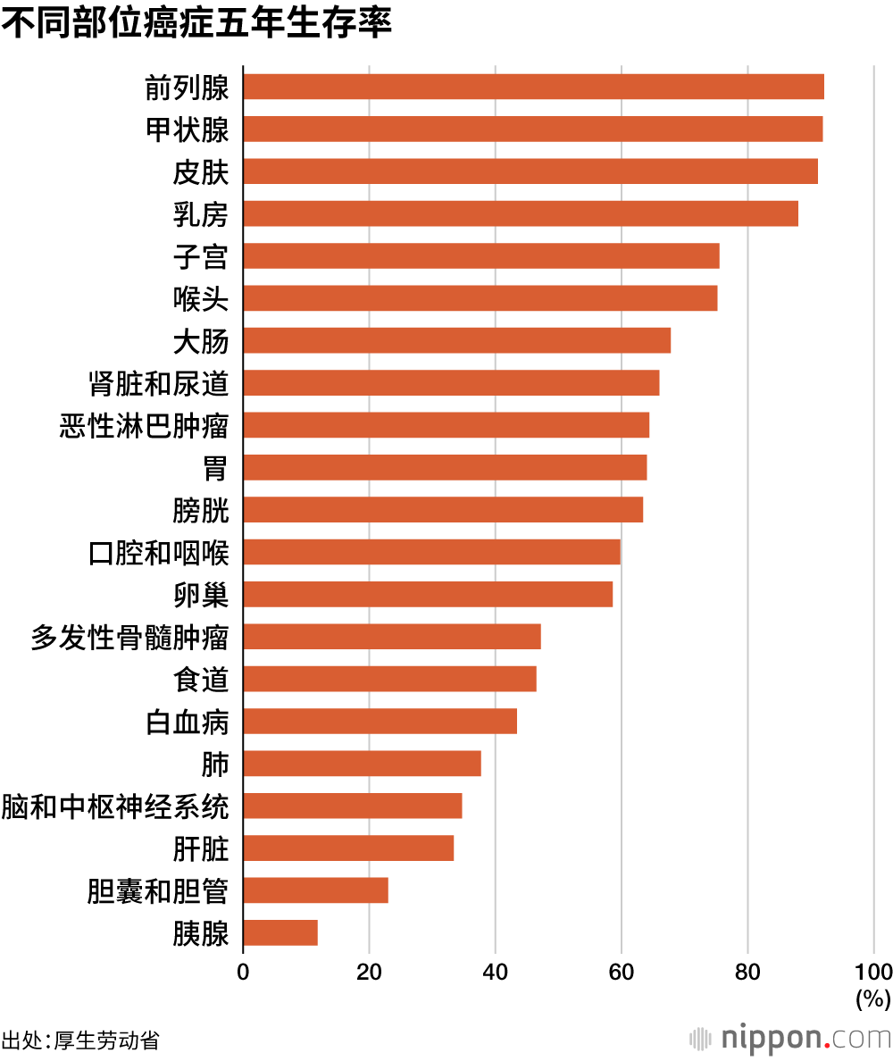 日本厚生劳动省近期公布了2016年全国被确诊癌症的新发病例存活到5年后的比例(五年生存率)。同年施行的《癌症登记推进法》规定所有医院有义务申报癌症患者信息,此次是首次根据全国癌症登记信息进行的统计。15岁以上患者生存率最高的患癌部位依次是前列腺(92.1%)、甲状腺(91.9%)、皮肤(91.1%),均超过了九成。而生存率最低的癌症依次是胰腺(11.8%)、胆囊和胆管(23.0%)。