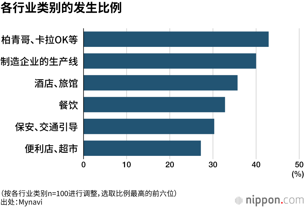 发生过兼职工恐怖袭击问题的受访企业占到整体的26.3%。从行业类别来看,“柏青哥、卡拉OK、网络咖啡屋”最多,占比达42.9%。其次是“制造企业的生产线”(40.0%)、“酒店、旅馆”(35.7%)。