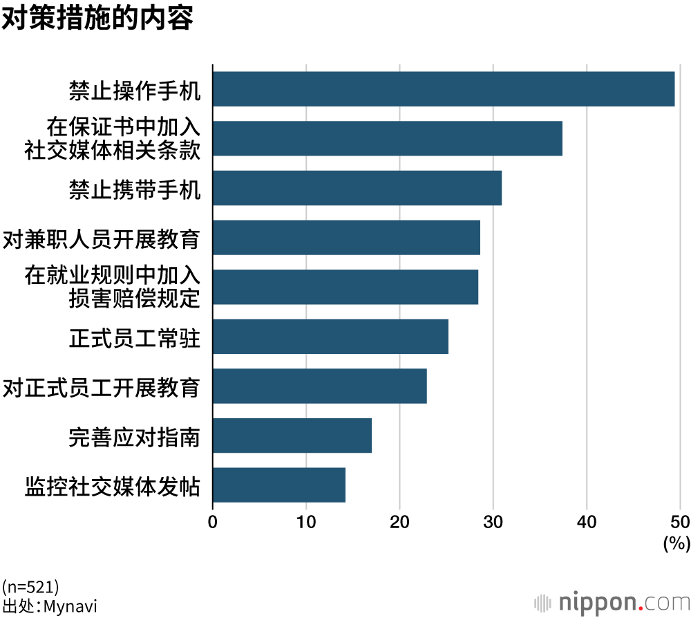 作为具体的对策,主要是“禁止工作期间操作或携带手机”,还有“在保证书中加入社交媒体相关条款”。