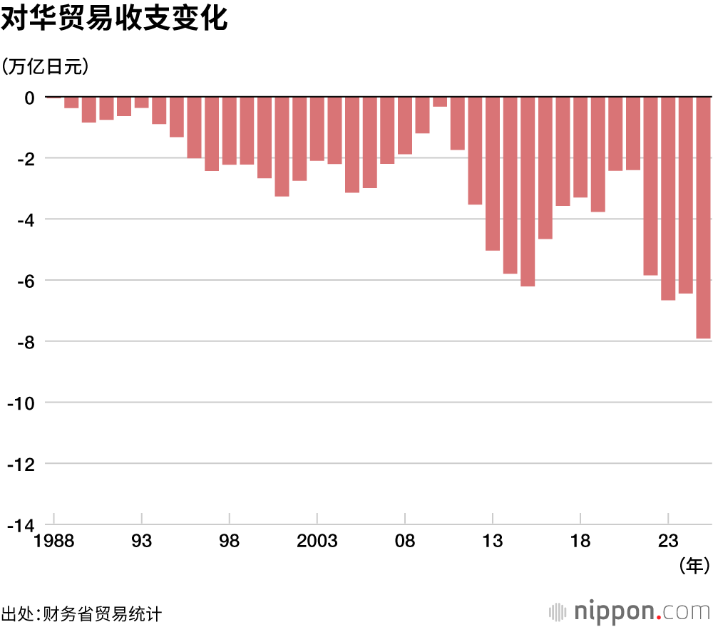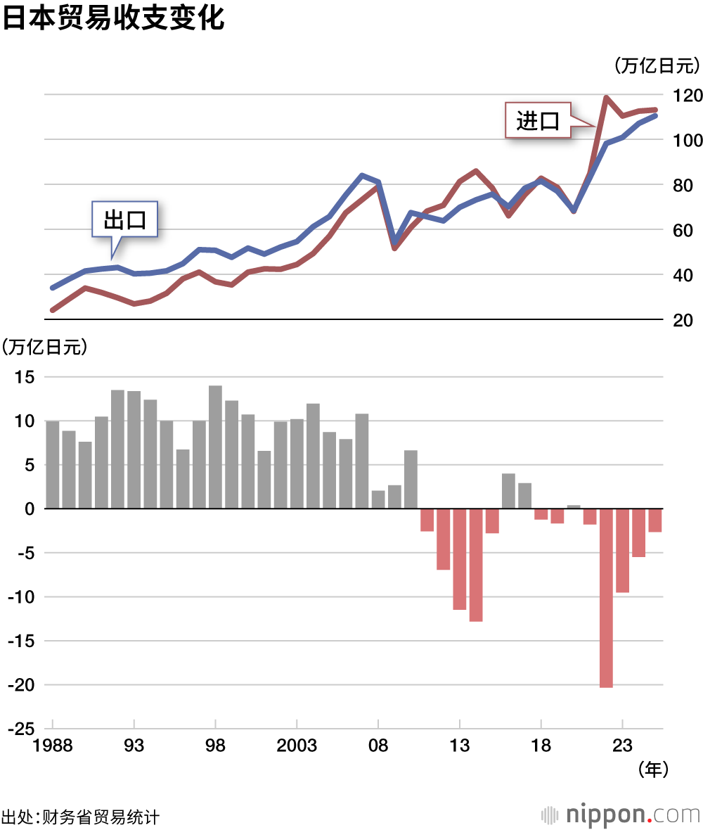 日本2025年贸易逆差(出口减去进口的差额)2.6507万亿日元。虽然连续五年出现贸易逆差,但其规模降低了52.9%。