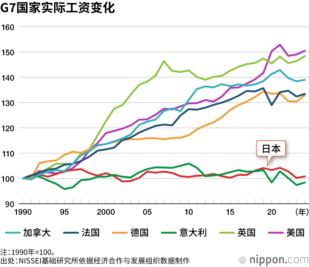 在国际上看,日本实际工资的低迷也显而易见。七国集团(G7)中,日本和意大利近似,从1990年以来基本处于原地徘徊状态。美国现在的实际工资水平是1990年的1.5倍,差距明显扩大。
