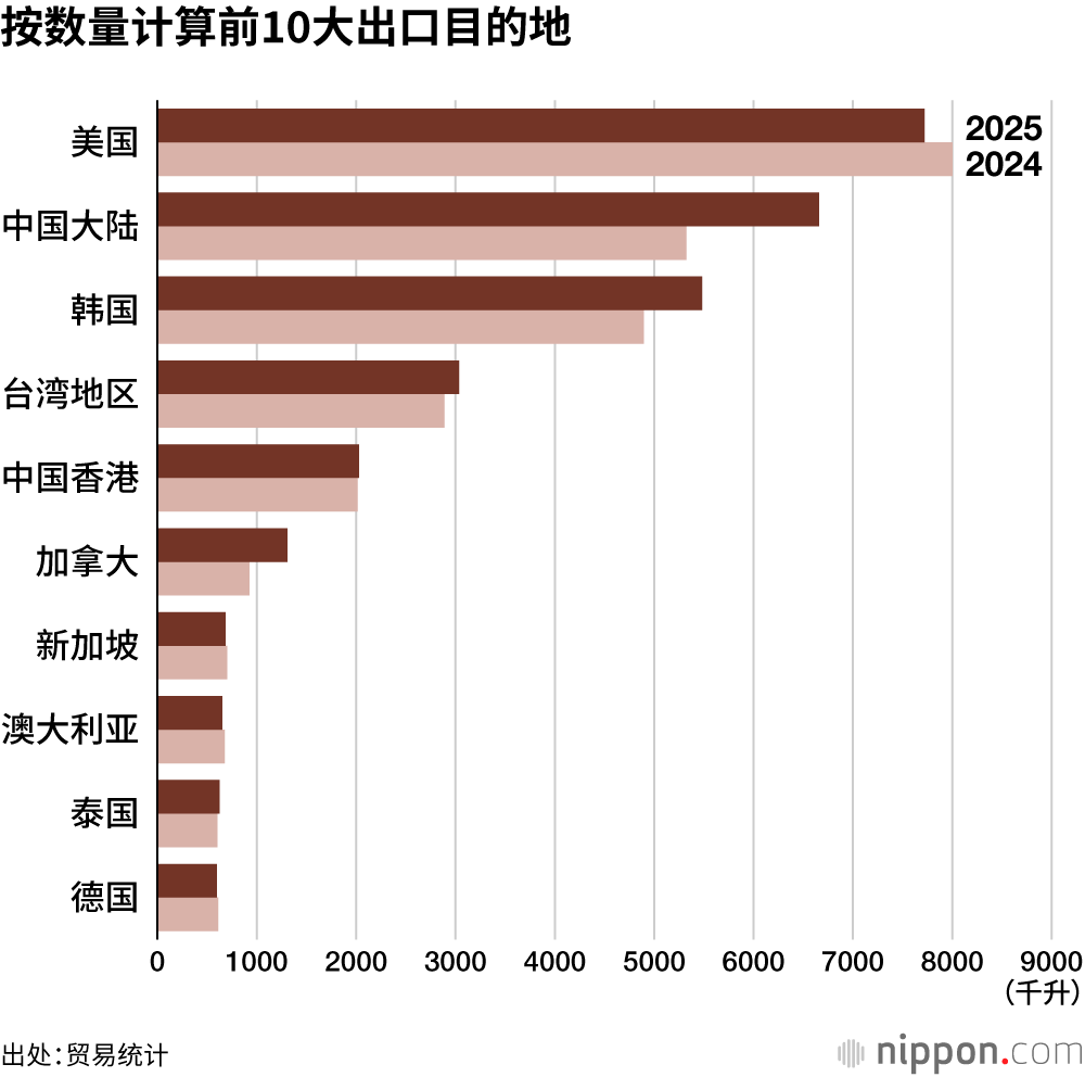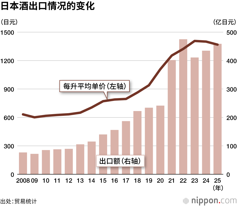 日本酿酒组合中央会的统计显示,2025年日本酒出口额同比增加5.5%至458.8亿日元,出口量同比增加8.0%至3.35万千升。尽管受到美国追加关税政策等因素影响,但出口额和出口量依然双双实现了两年连续增长。