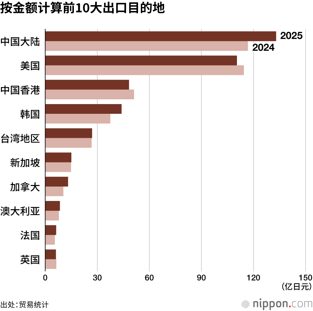 对中国大陆出口额居各国各地区之首,同比增加13.9%至133亿日元。对美出口额次之,同比减少3.5%至110亿日元。按出口量计算,前两位正好调换位置,对美出口量同比减少3.5%至7720千升,对中国大陆出口量同比增加25.1%至6660千升。