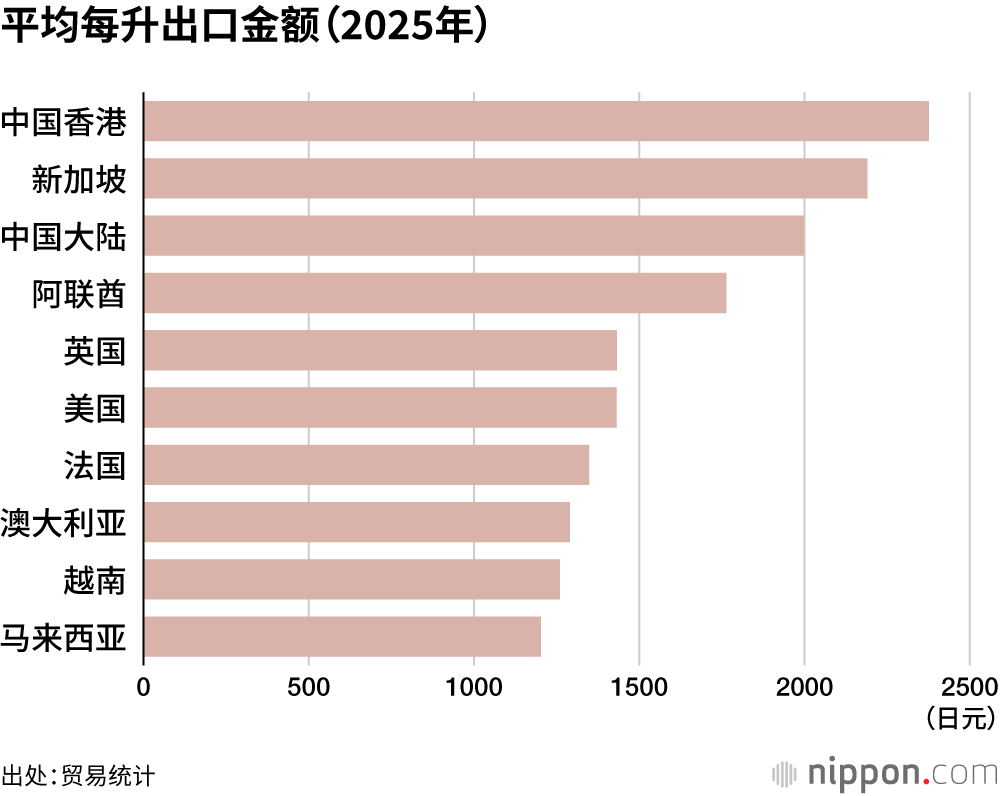 平均每升出口金额为1368日元,已上涨至10年前(771日元)的1.8倍。相对价格较高的日本酒继续保持引领全球市场之势,对香港和新加坡的平均每升出口金额和上一年一样超过2000日元。中国大陆方面,日本酒进一步拓展市场,经销量增多,单价从上一年的2193日元降至1998日元。