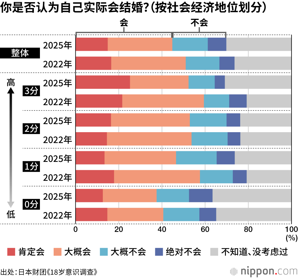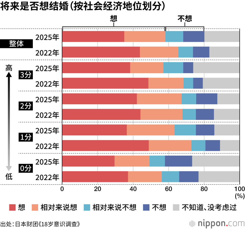 日本的少子老龄化问题在整个世界都显得尤为突出。日本财团为把握年轻人的思想和行为模式,一直在持续开展《18岁意识调查》。2025年11月末至12月上旬就结婚生子等人生规划问题实施了调查,下面是与2022年12月实施的相同主题的调查比较结果。