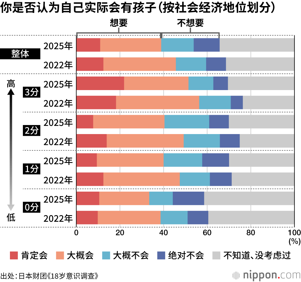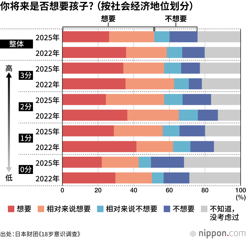 表示将来“想要(“想要”和“相对来说想要”的合计)”孩子的受访者比例整体上也减少7.1个百分点至51.5%。即便政府采取了各种应对少子化问题的措施,但并未形成年轻一代想要生育的动力。和结婚意愿一样,社会经济地位较低组别的人群想要孩子的意愿较低。