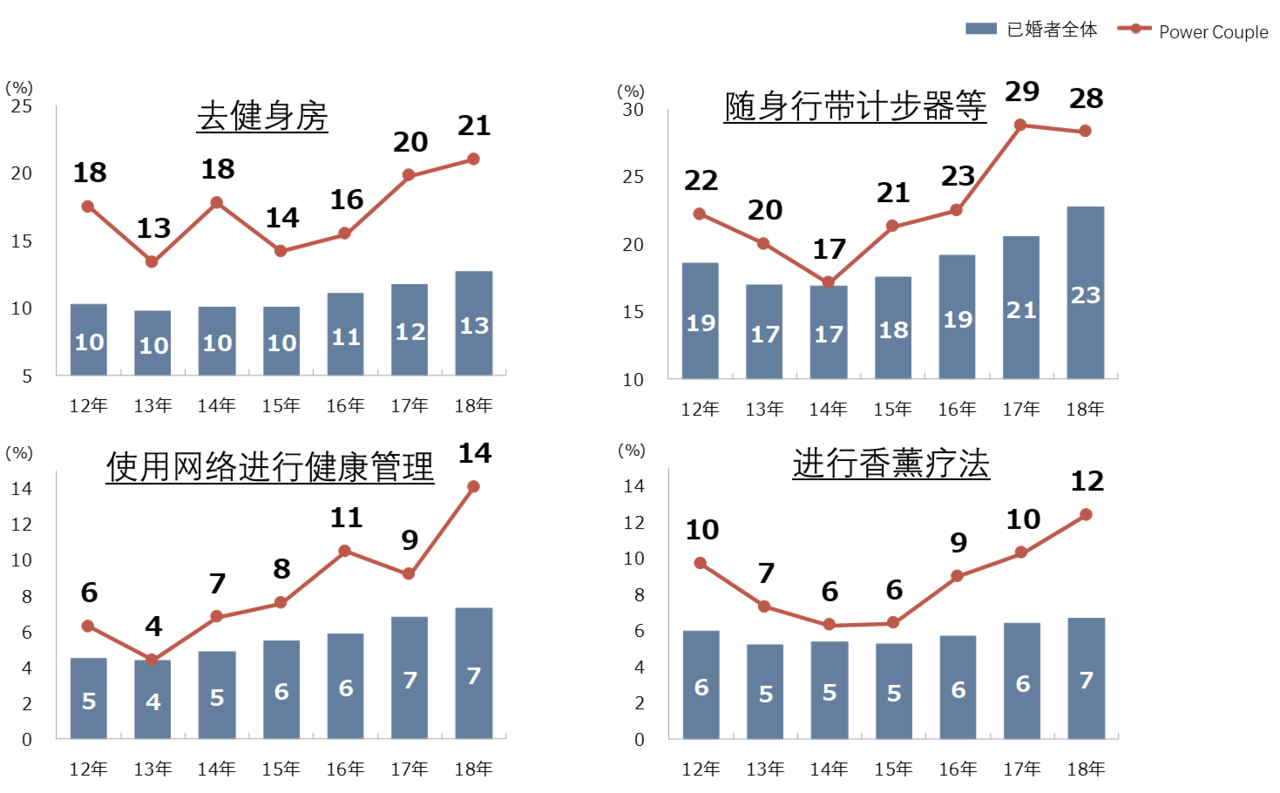 为了迎接人生100年时代的来到,Power Couple也把更多的消费重点放在了对未来的准备上。如图2可知,他们中有越来越多的人选择去健身房,携带计步器,或者用网络进行健康管理,甚至去进行香薰治疗。这些比例都比已婚者全体的数字高出不少。