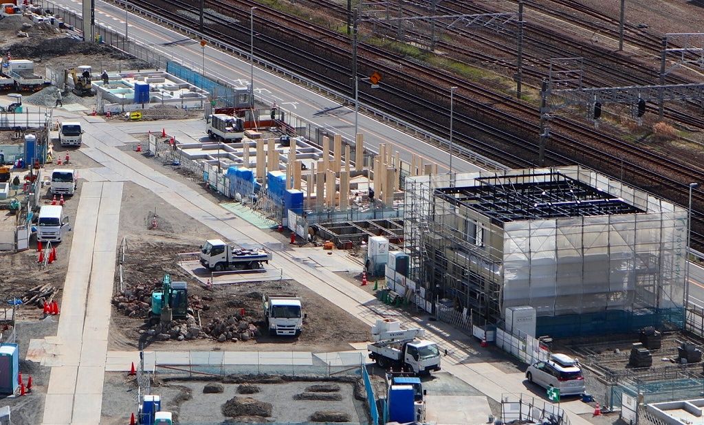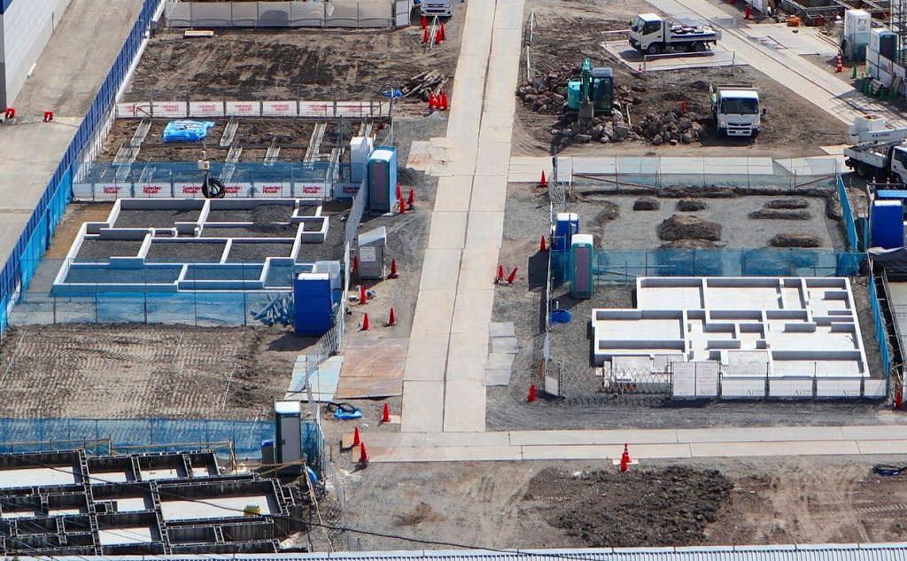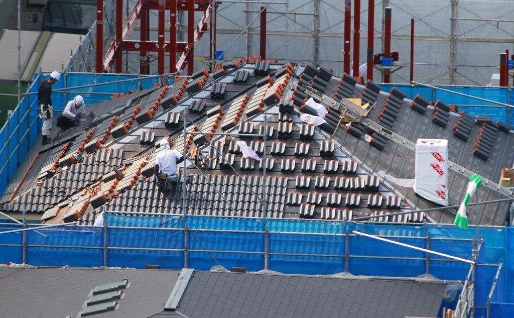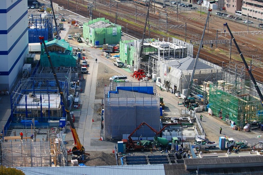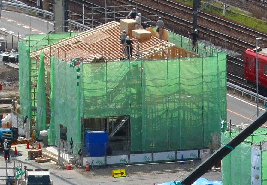 1个半月之后,工地进入繁忙状态。从安全和防止建筑灰尘扩散,地基打好以后,周围都被塑料布围起来,建房施工都在里面进行。日本的造房施工都是这样,除了上述理由之外,或许还有出于商家形象和美学观点的思考,外观整体完成之后的建筑给人们带来惊讶的效果会有很大的冲击力。笔者虽然有幸从高处俯瞰施工过程,最多也只看房顶部分的施工。