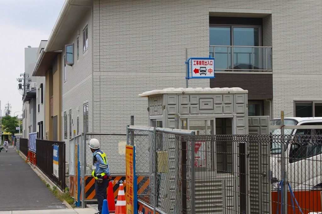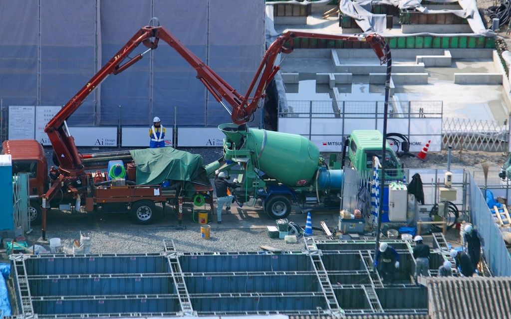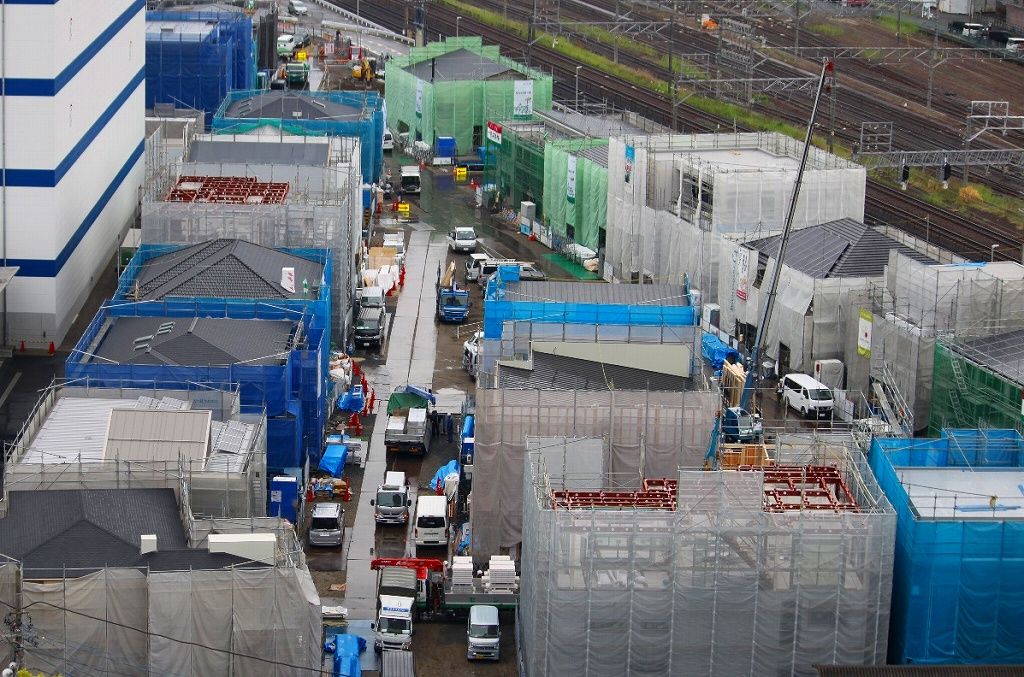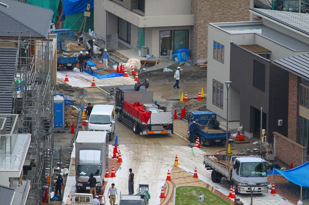 24栋样品房(有的商家同时建造两种不同形式的房子)同时开工,各家的运输建材和建筑设备的车辆频繁出入。鸿池组制定了严格各家公司汽车进出的时间管理表来保证工地的安全和进出口通畅。日本城市的住房之间距离很小,为了尽量减少对周围邻居和路面通行的影响,施工场地限制在宅地范围内。而这里彼此相邻的24户同时建房,现场搅拌混泥土,大型建材吊装,最多的时候,5台长臂起吊车同时操作,场面甚为壮观。尽管这样,各家的器械设备、材料和汽车都紧紧靠在自己的地盘,都努力不影响其他商家的施工。