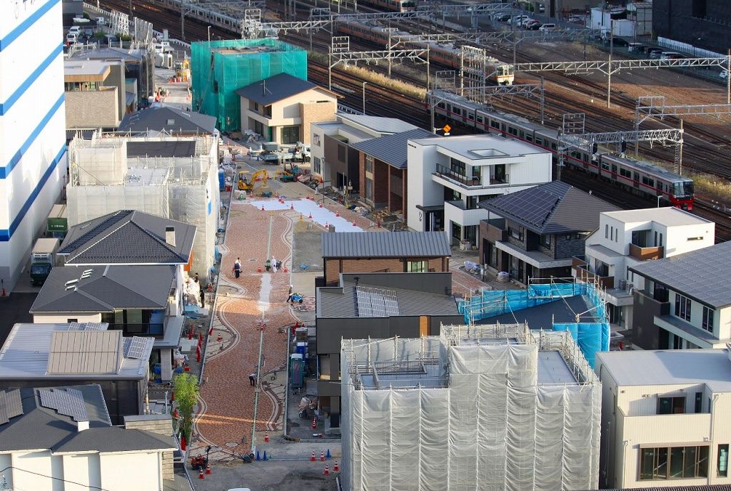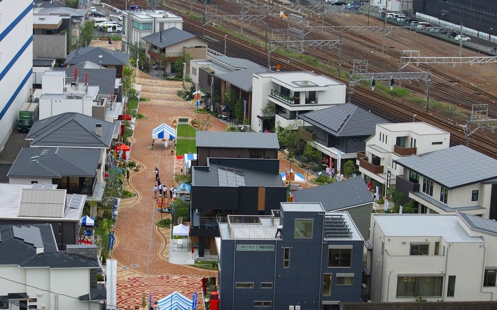 日本独院住宅的历史延续到现在,大大小小的建筑公司非常多,无论是传统型工务店还是一流房屋建筑公司,都瞄准着不同层次不同要求的消费者而不遗余力地展开广告宣传来提高存在感。这样大规模样板房展示中心的投资商是日本中部地区一家最大的报社,应招而来的19个商家将分别建造自己的样板房。鸿池组公司为各建筑公司整备好用电和上下水基础设施,3月初,各建筑公司在规划的地盘上相继开工建房。公共区域的道路和停车场和其他公用设施由鸿池组施工建造。