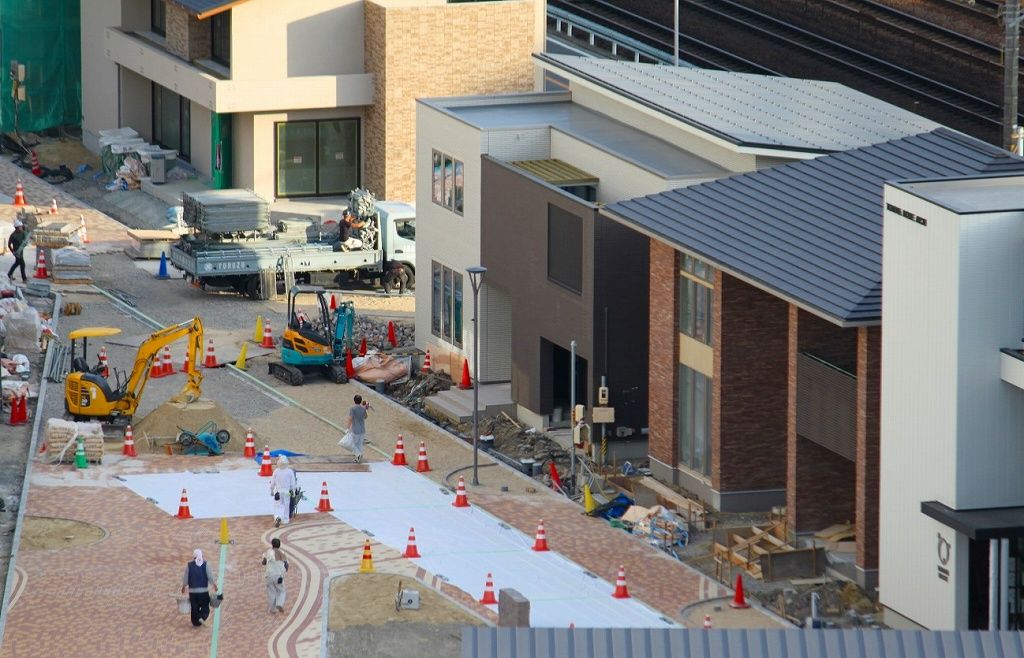 2个月之后,建好的房屋相继以各种姿态出现在人们的眼前。随后是内部装修,与此同时,公共场所的道路和停车场的施工也在紧张地进行。