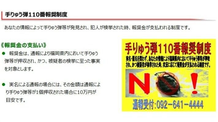 普通人恐怕一辈子都没有见过手榴弹,但是福冈呢,似乎很多见,以至于当地警方专门成立了一个手榴弹有奖举报热线。得知有人私藏或携带手榴弹,可以拨打热线提供线索,警方每缴获1枚手榴弹,举报人便可获得10万日元的奖金。