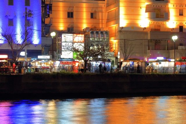 不同的屋主与不同的常客,构成了一个又一个不同氛围的空间,是屋台文化独有的魅力特征。福冈的屋台,主要集中在中洲、天神、长浜这三处,沿着那珂川分布,一般是带着两个轱辘的活动房屋,需要每天在开张前,从车库牵引到指定的地方,结束后,再牵引回车库寄存。这样的屋台文化还为福冈提供了很多特色工种,比如专门拉屋台的人力车夫,再比如专门制作屋台的木工匠人等。
