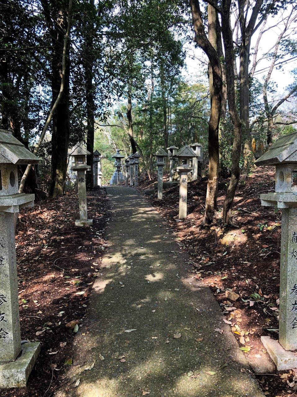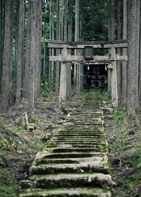 继续前行一公里左右,就可以从层层杉树中隐隐约约地看到神社的影子了,再走几步,映入眼帘的是一条笔直的参道和一座鸟居。因为平时来参拜的人不多,非常安静,所以这里的参道和鸟居都被厚厚的青苔所覆盖,更是为它增添了一层神秘感。参道两侧高大笔直的杉树遮挡住了一些光线,阳光顺着密密的杉树干照射下来,形成了一束束粗细相间的光柱。