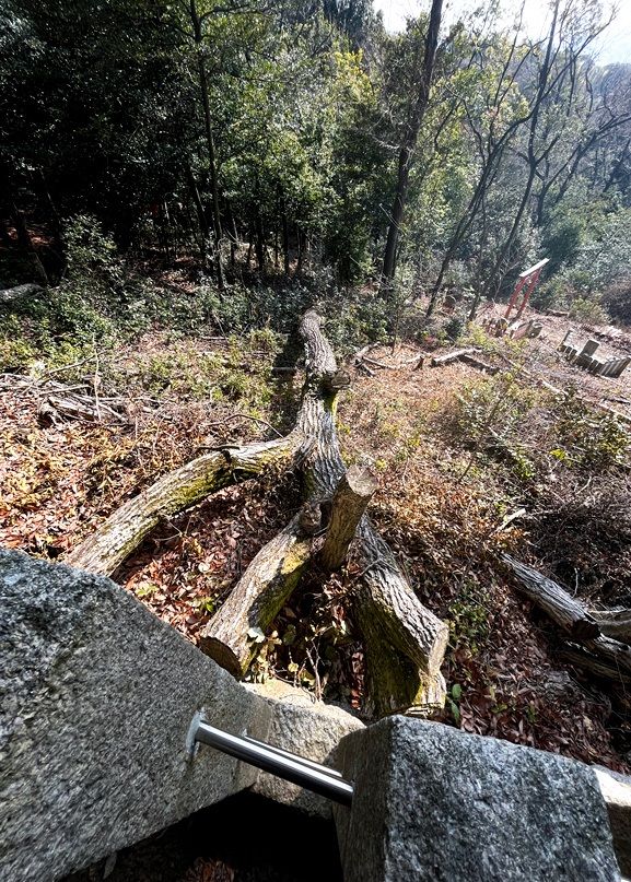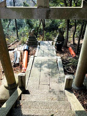 沿着鸟居继续向上,便能看到2018年那场台风留下的痕迹。这里强烈的废墟感能让人直接感受到台风对它的破坏,朱红色的粗壮鸟居从底部直接被吹断,倒在一侧。堂本印象捐赠的小鸟居也没能在这场台风中保存下来,雕刻着神灵名字的牌匾则靠在断掉的鸟居底座旁。