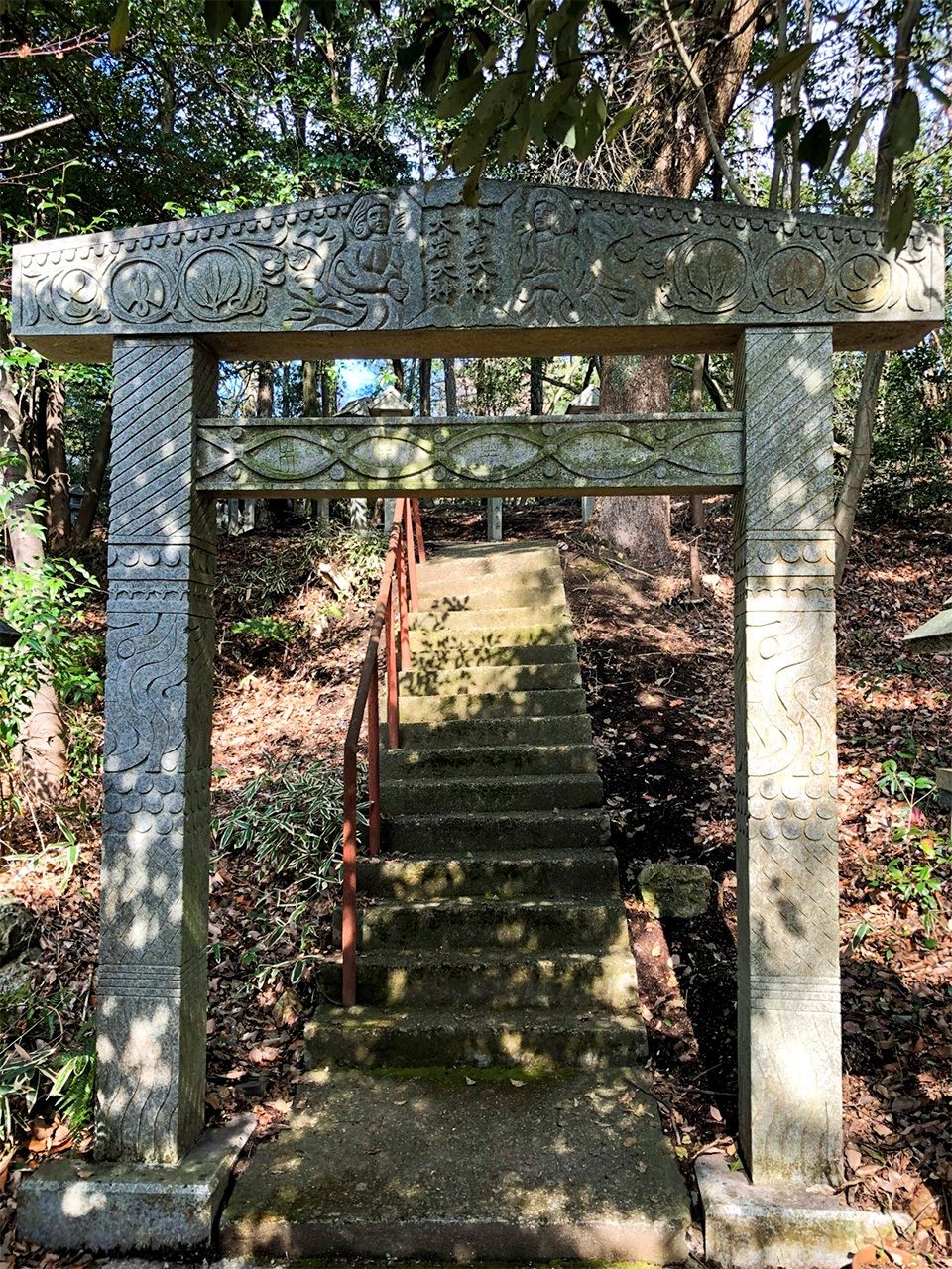 大岩神社最有名的便是一大一小的石雕鸟居了,这两座鸟居是由日本知名画家堂本印象雕刻并捐赠的。顺便提一句,堂本印象在京都有自己的美术馆,有极为独特的个人风格,建议大家有机会可以前去一看。鸟居上有男神女神像以及一些纹样,纹样看起来与日本的神社格格不入,颇有东南亚风情,充满了堂本印象的艺术色彩。