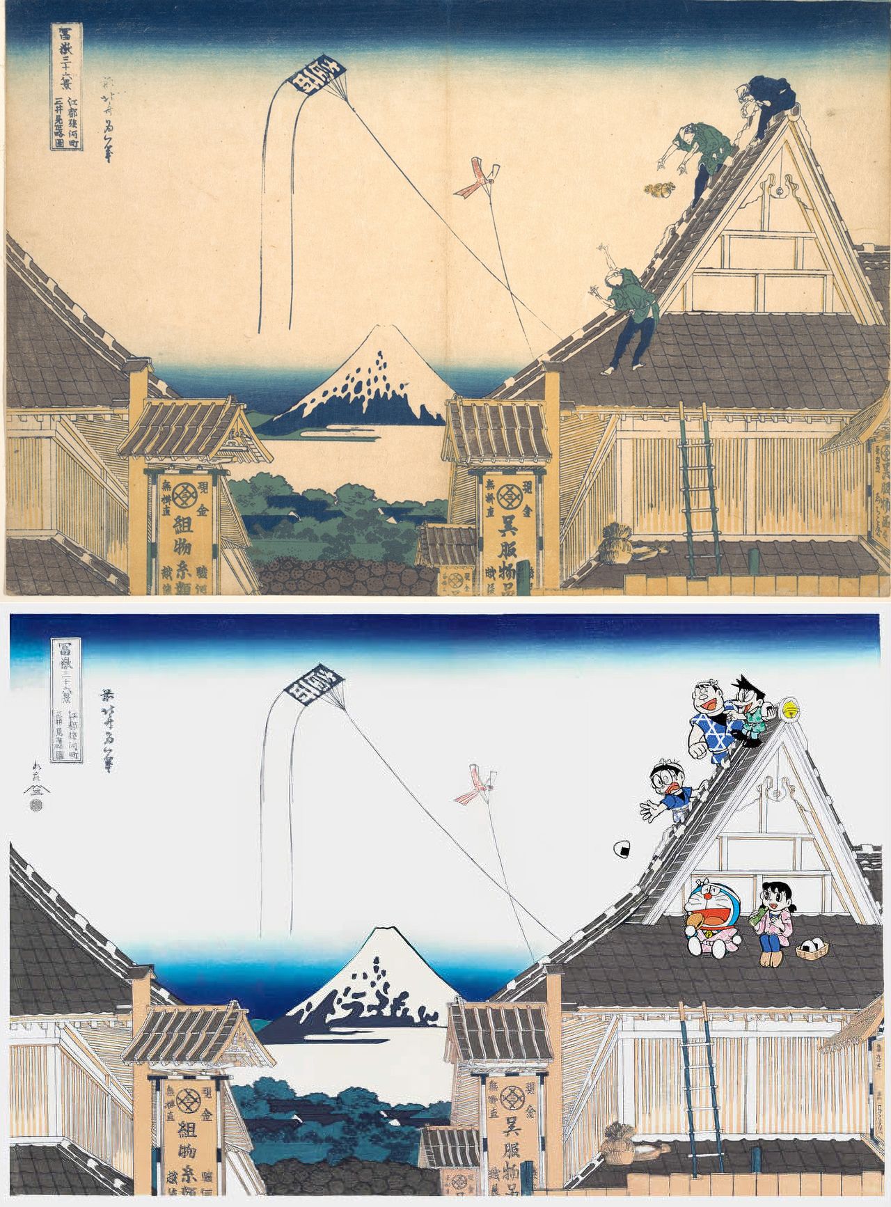 上:葛饰北斋《富岳三十六景 江都骏河町三井见世略图》(大都会艺术博物馆藏) 下:哆啦A梦浮世绘木版画《富岳三十六景 江都骏河町三井见世略图》(版三提供)©Fujiko-Pro