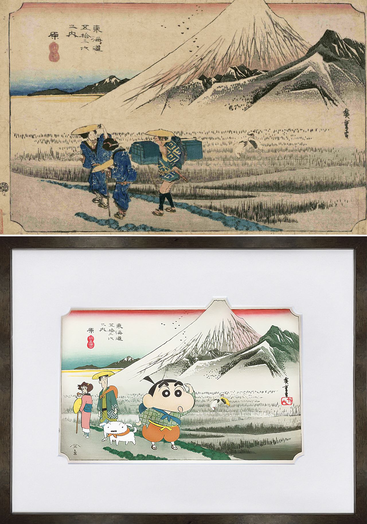 上:歌川广重《东海道五十三次内 原 朝之富士》(东京都立中央图书馆藏) 下:蜡笔小新浮世绘木版画《东海道五十三次内 原 朝之富士》(版三提供) ©臼井仪人/双叶社 Shin-Ei动画 朝日电视台 ADK