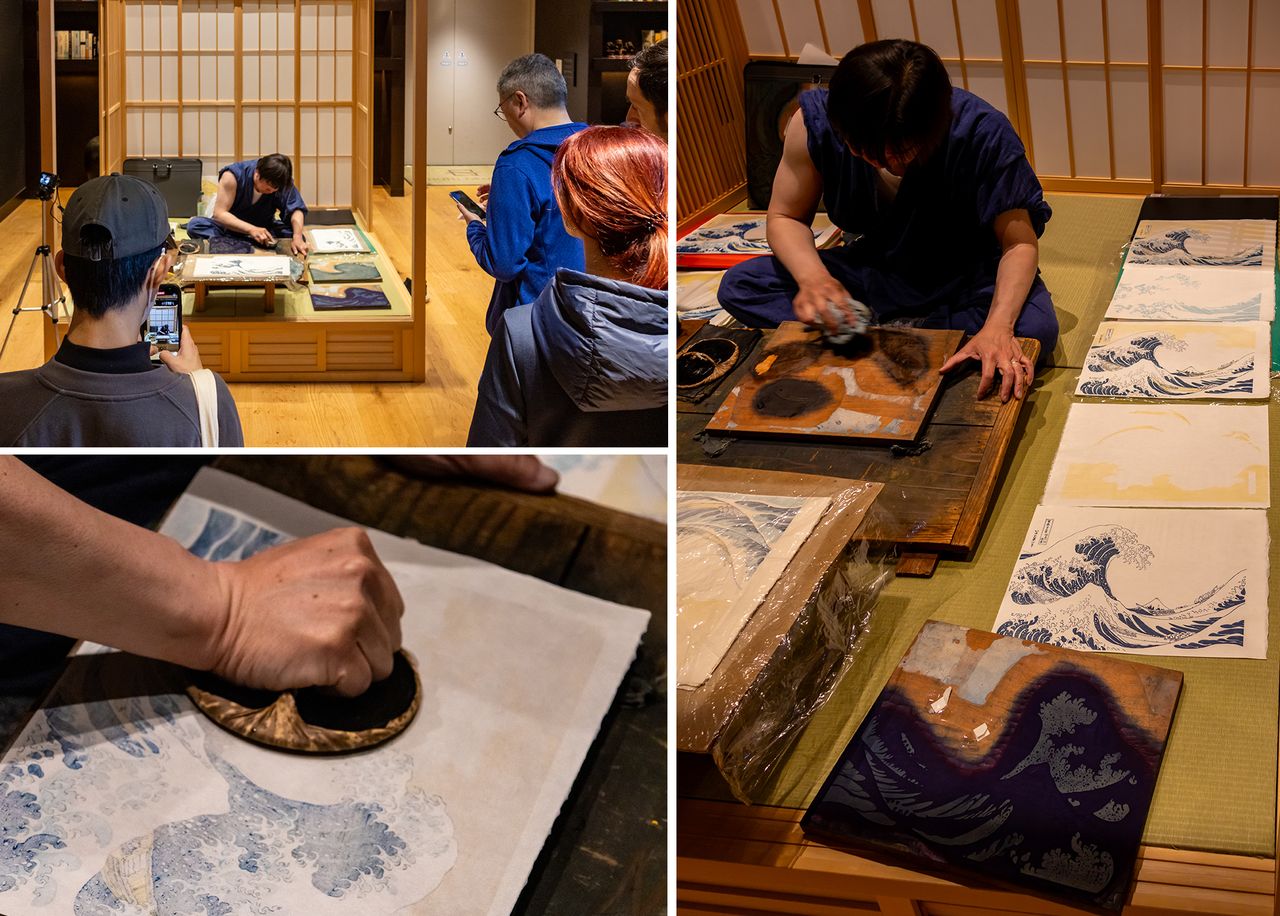 版三在外国客人占9成的新宿格拉斯丽酒店举办活动,现场表演浮世绘拓印技术