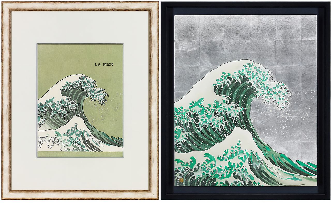 左:德彪西《大海(LA MER)》的管弦乐谱初版封面 浮世绘木版画 右:“LA MER (VAGUES VERTES JADE /翡翠浪涛)”是用白金金箔画的原稿(版三提供)