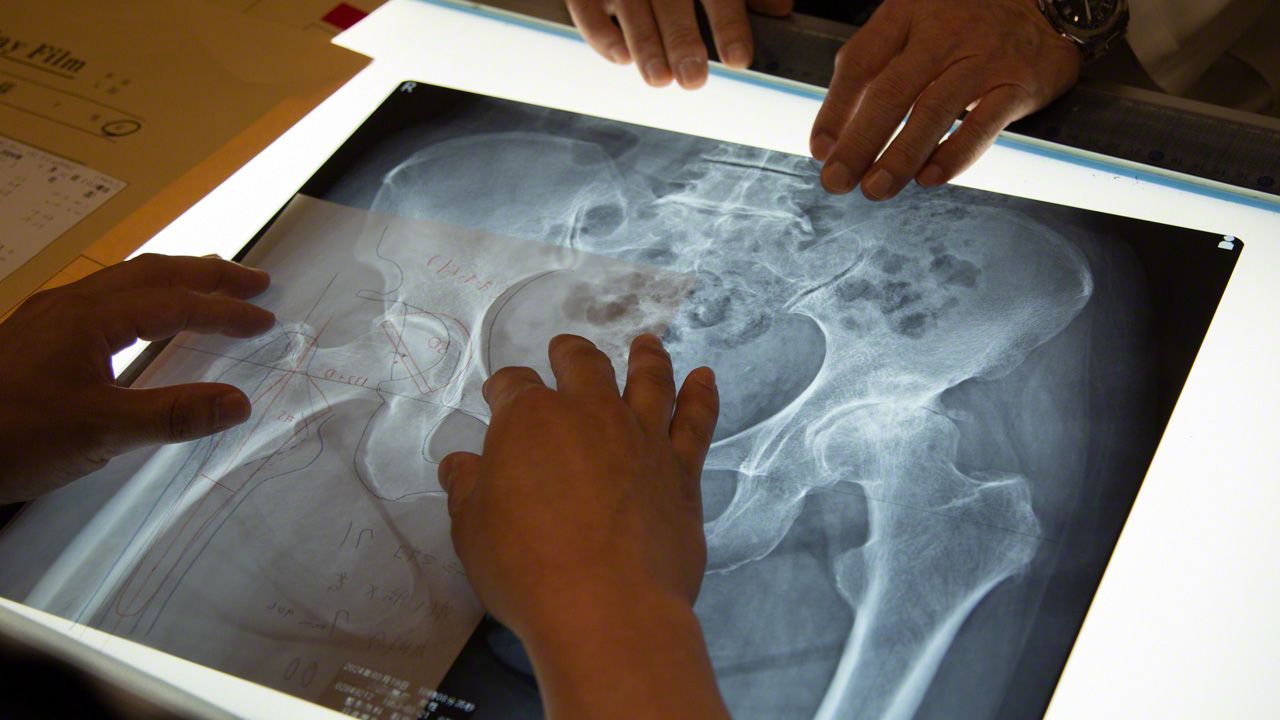 “人工髋关节装上后就是这样的。”松原医生细致地进行术前说明,直至患者充分理解