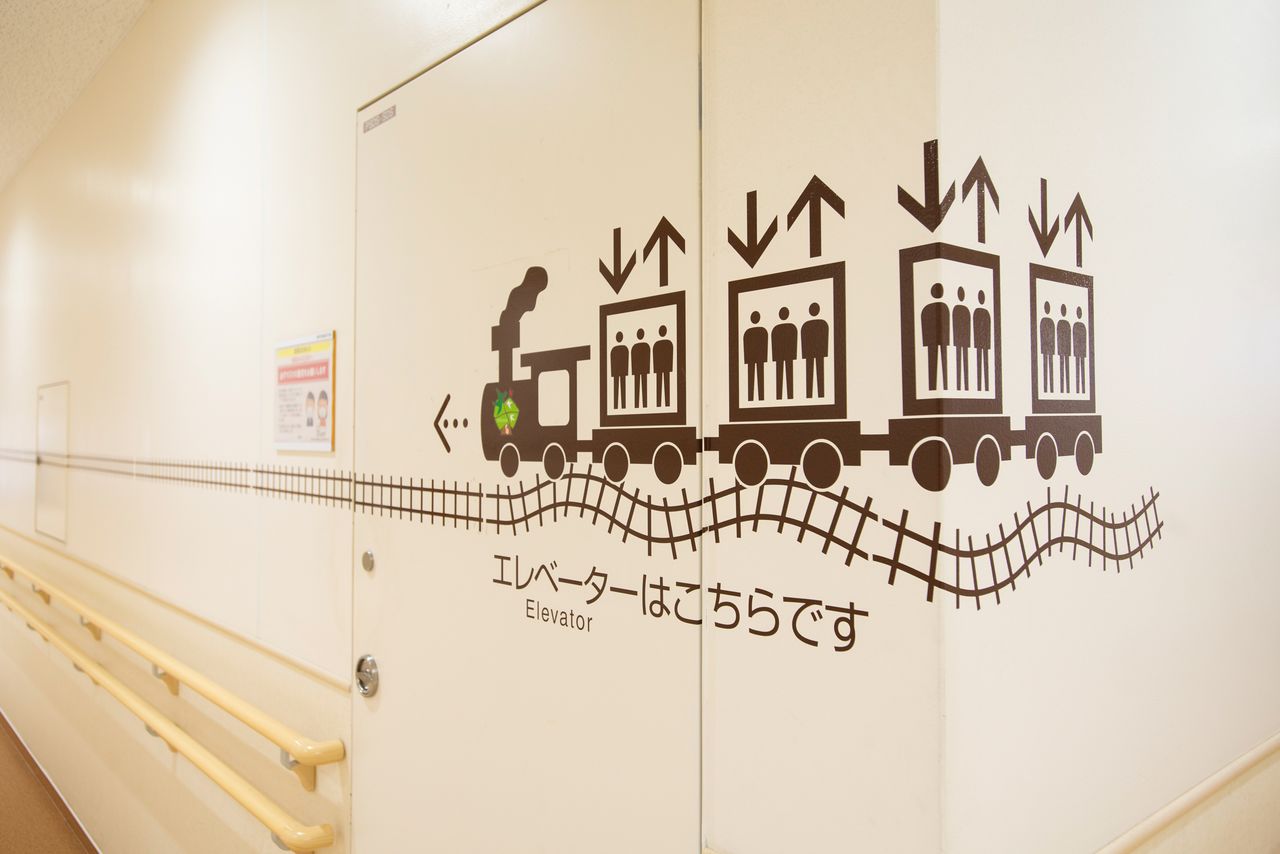 走进绘有鲜艳的红蓝黄三色树木的建筑,可见儿科大厅中有一座大的白色树木装置。人可以进入树干内部,对于不擅长等待的孩子们来说,这里正好可以成为一个游乐场。电梯的指示标则设计成小火车的模样,顺着小火车的路线前行,就能找到电梯。