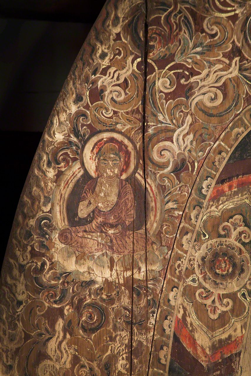 光背表现的是佛光,通常是在板材表面用雕刻的方式呈现出纹样。而这尊佛像的光背由超过两米的木板拼接而成,上面用彩色颜料描绘有莲花纹和七佛药师等图案。氛围庄重威严,如观看曼荼罗一般。