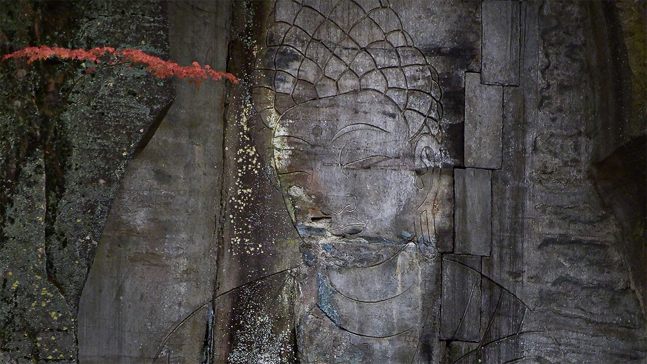 雕刻师登上木材和竹子搭成的脚手架,在岩壁上凿刻出超过13米高的背光,再将背光内侧打磨平整,用线条刻画出高达11.5米的弥勒菩萨立像。规模虽不及东大寺大佛(15米),却是日本国内最大的摩崖佛像。佛像身披袈裟,头部略微向右倾斜,细长的双眸似乎在温柔地俯视着芸芸众生。双足各踏一个莲花台座,日语叫作“踏割莲华座”。