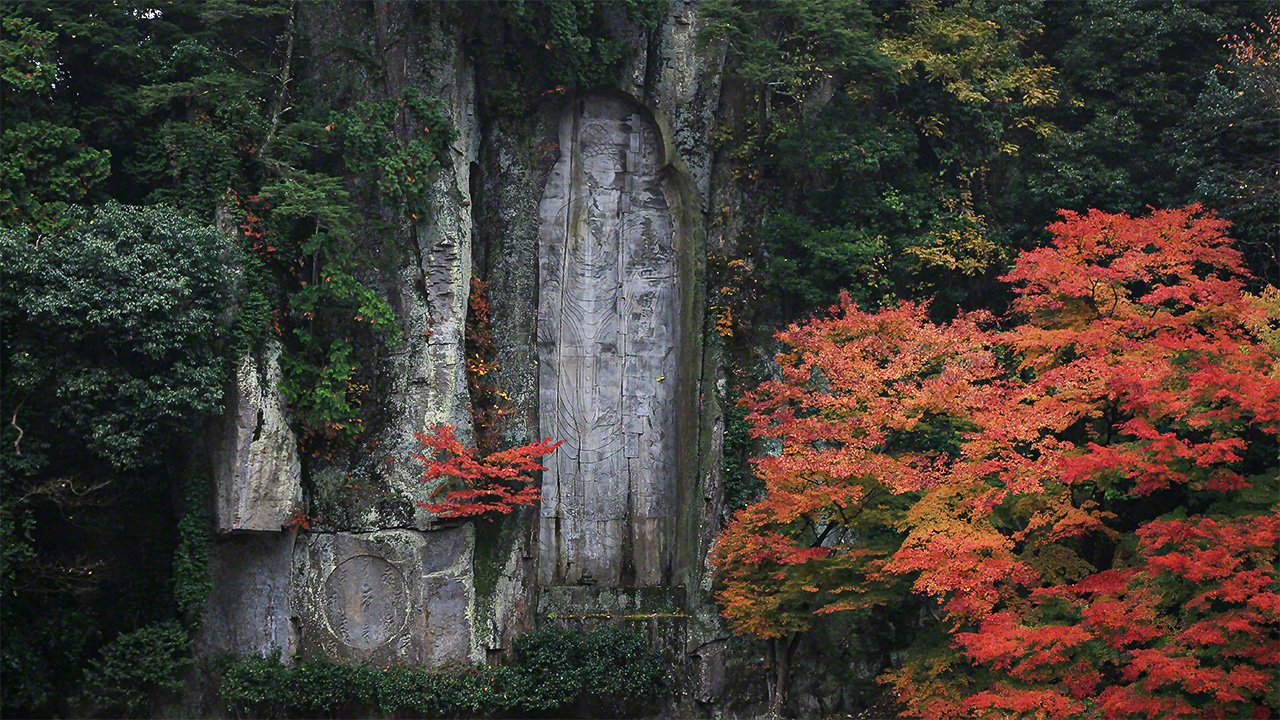 真言宗室生寺派的古刹大野寺(奈良县宇陀市)境内,清澈的宇陀川对岸高耸的岩壁上,矗立着一尊巨型弥勒菩萨摩崖雕像。