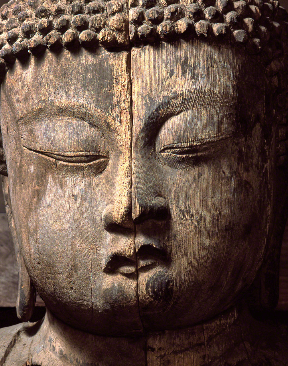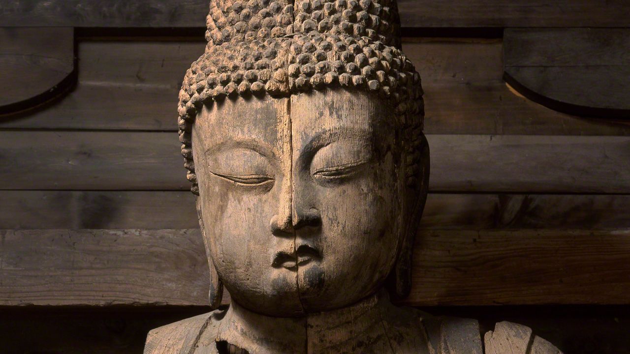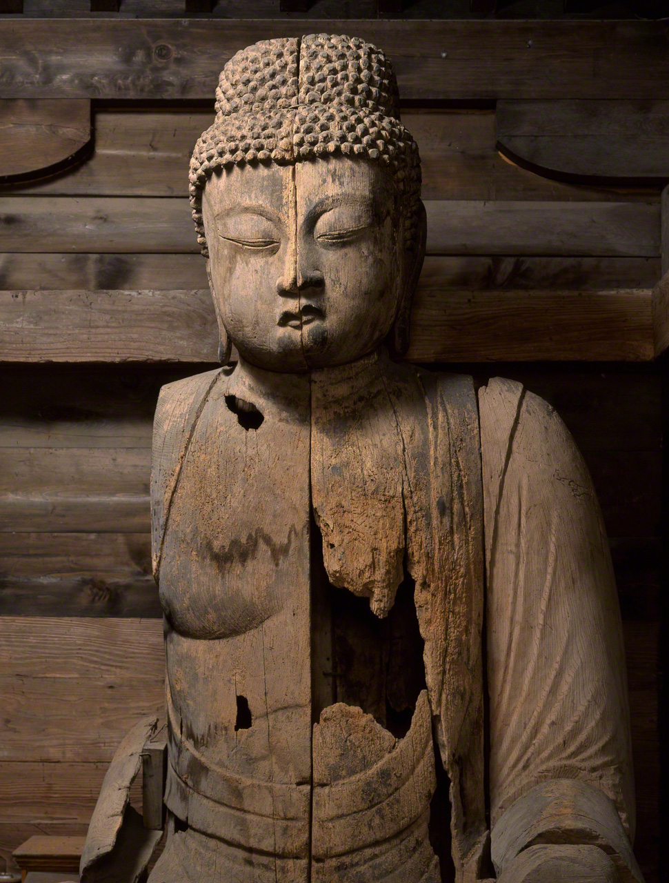 寺内供奉的主佛像被列为重要文化遗产,本应成为拍摄的重点,但摄影师六田知弘称自己被静坐于其右侧的另一尊阿弥陀佛散发出的气韵深深吸引。它损毁严重,像高与主尊同为2.7米。佛像正中央有一道裂痕,可见这尊佛像是用拼木雕刻法制作而成的。