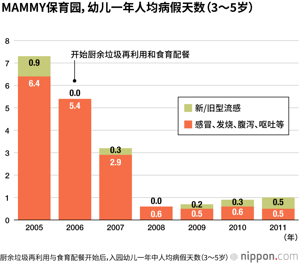 长崎县佐世保市的私立保育园MAMMY用于配餐食材的蔬菜中,有一半用的是和保育园小朋友一起通过厨余垃圾再利用种植的无农药蔬菜。堆肥是用配餐或小朋友家里的厨余垃圾发酵制成的。配餐中还提供和孩子们一起制作的味噌、咸菜、梅干及米糠腌菜等发酵食品。2006年开始提供改进后的配餐并带领孩子到野外玩耍,当时年人均病假天数平均为5.4天,两年后减至0.6天。