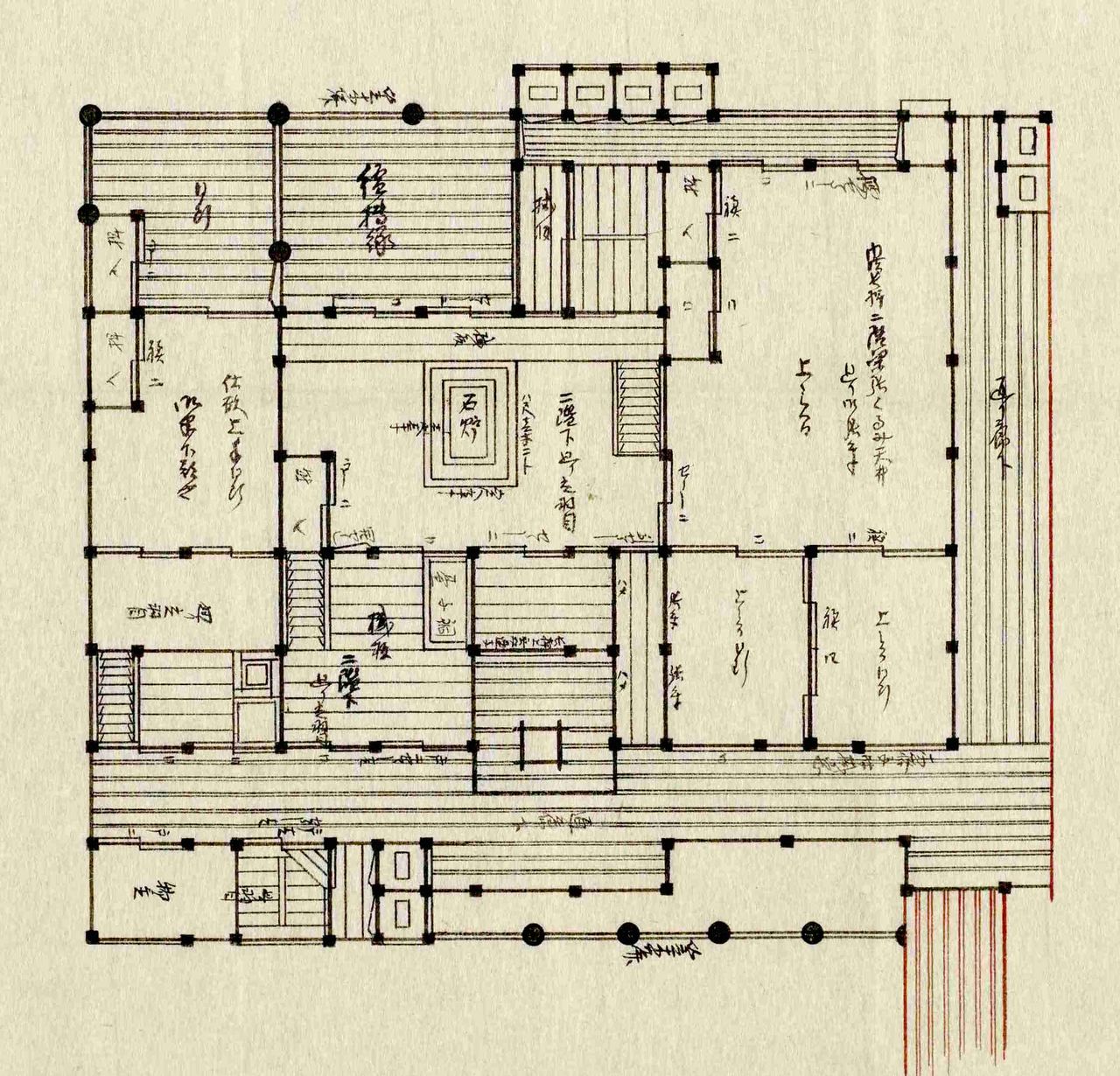 “三之侧长局地绘图”为职制较低之女官居住区域之平面图。藏于东京都立中央图书馆特别文库室