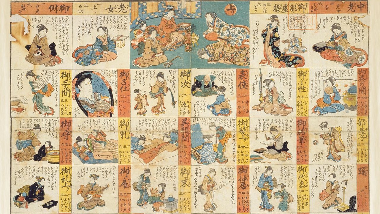 标题图片:江户时代少女们嗜玩之“奥奉公出世双六”,依骰子所掷点数推进棋子,终点为御台所。此桌游之插图显示出女官之职制(国立国会图书馆藏)