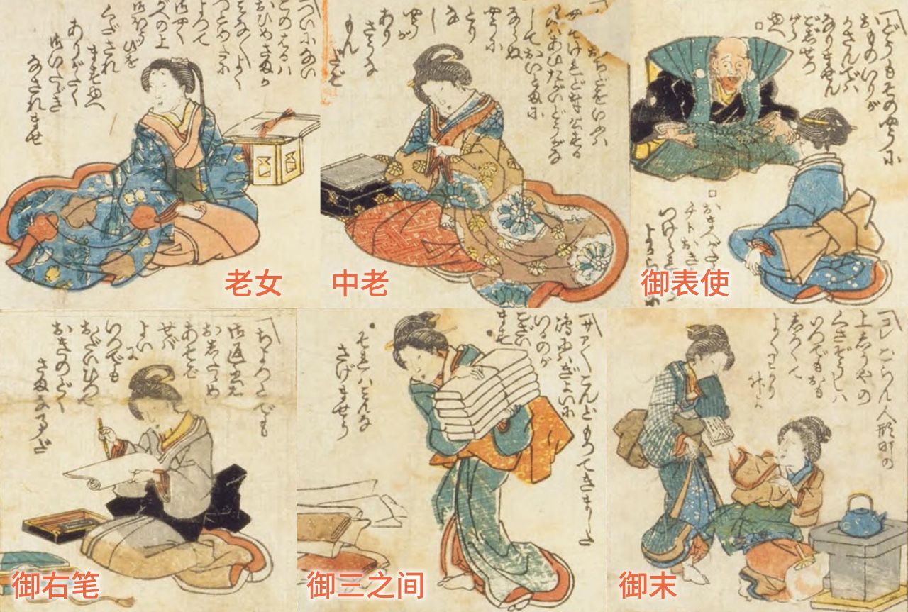 本文从双六里摘录某些主要的职务制度。虽然时代剧中大家熟悉的职位是“老女”(御年寄)与“中老”(御中臈),其他职位则不太为人所知,希望可以一并参照本文开头的表格。