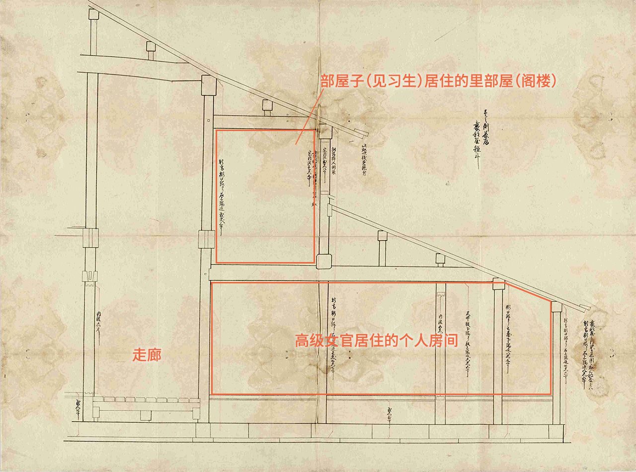 然而,此等房间为仅有高级女官获准居住之“个人房间”。其阁楼里,则常驻有负责照料该女官个人事务之“部屋子”(见习生)。