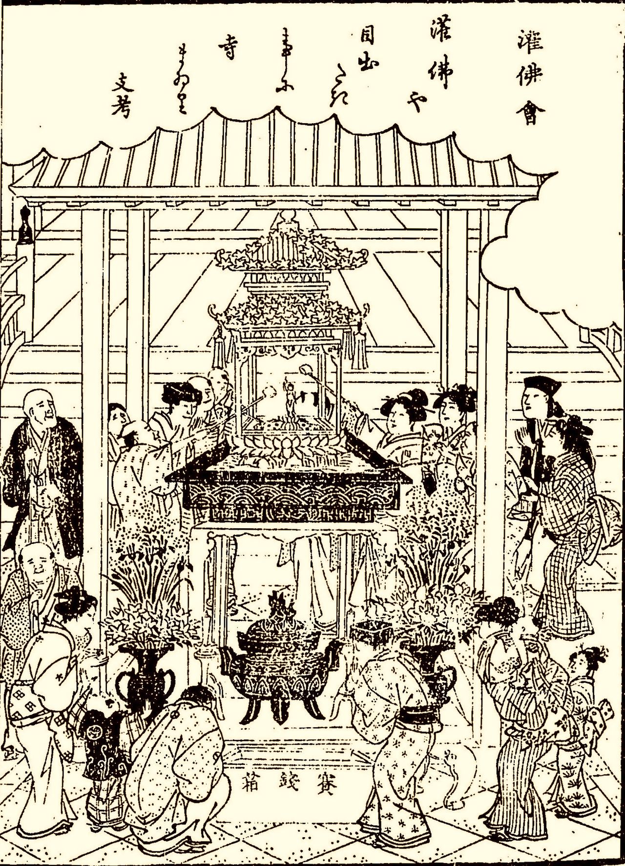 相传释迦牟尼佛诞生于农历四月初八,这一天各地的寺庙都会用鲜花装饰佛堂(花御堂)以示庆祝。这一活动被称为“浴佛会”,由于佛堂内摆放牡丹、芍药、燕子花等各种鲜花加以装饰,因此又名“花祭”。